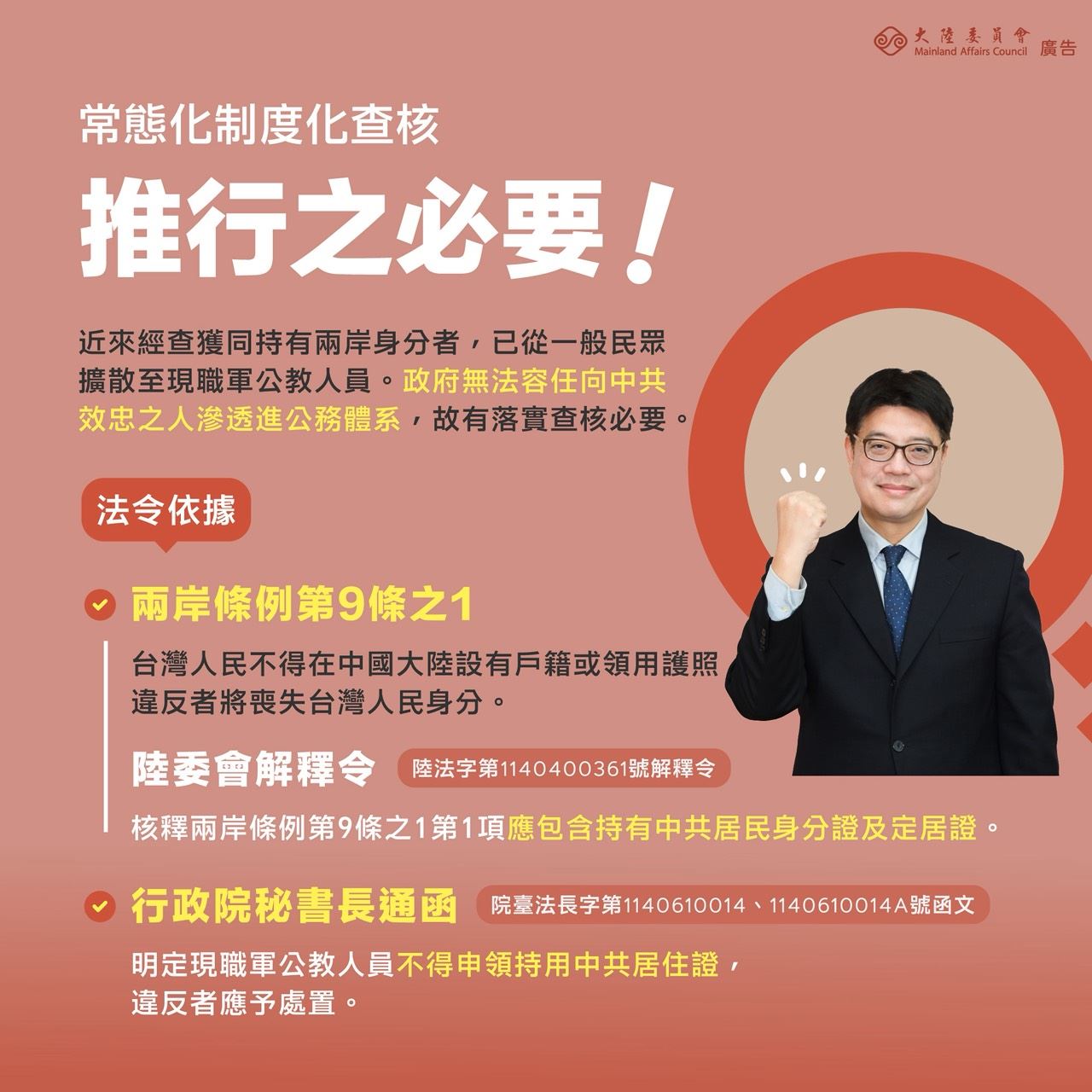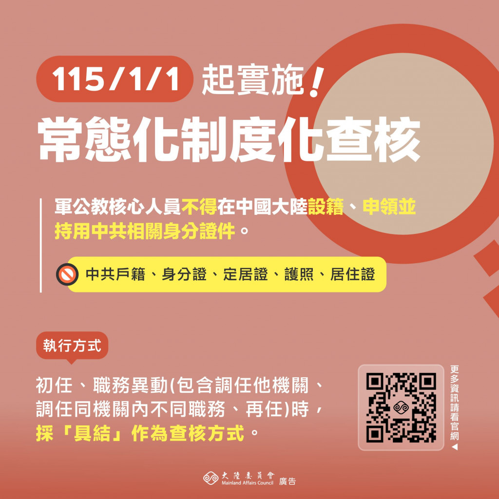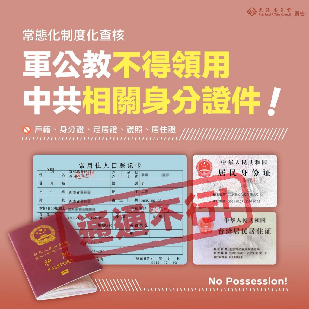 【宣導】常態化制度化查核軍公教人員不得在中國大陸設籍、領用中共相關身分證件。