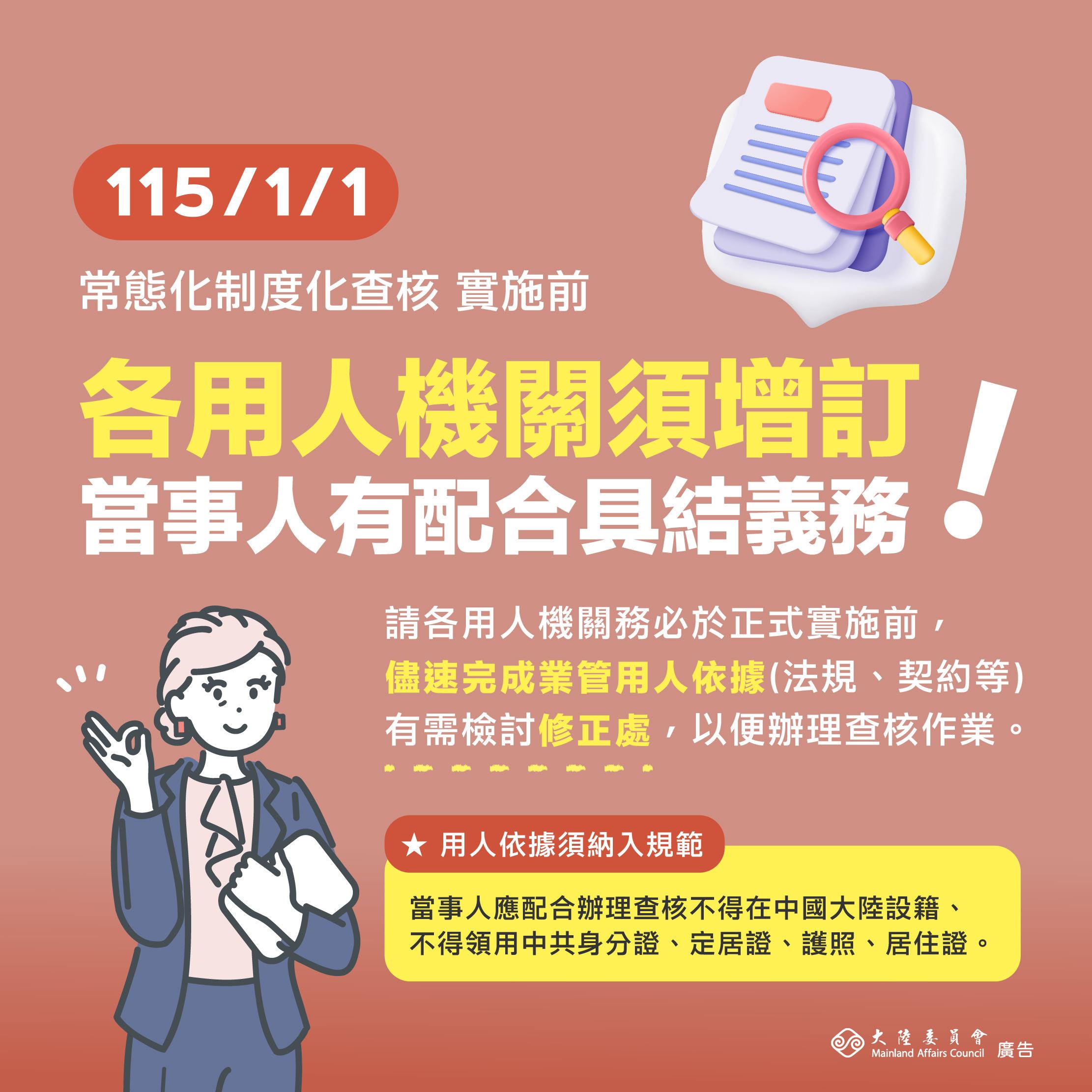 轉知陸委會修正「常態化、制度化查核人員範圍表」及宣導海報。