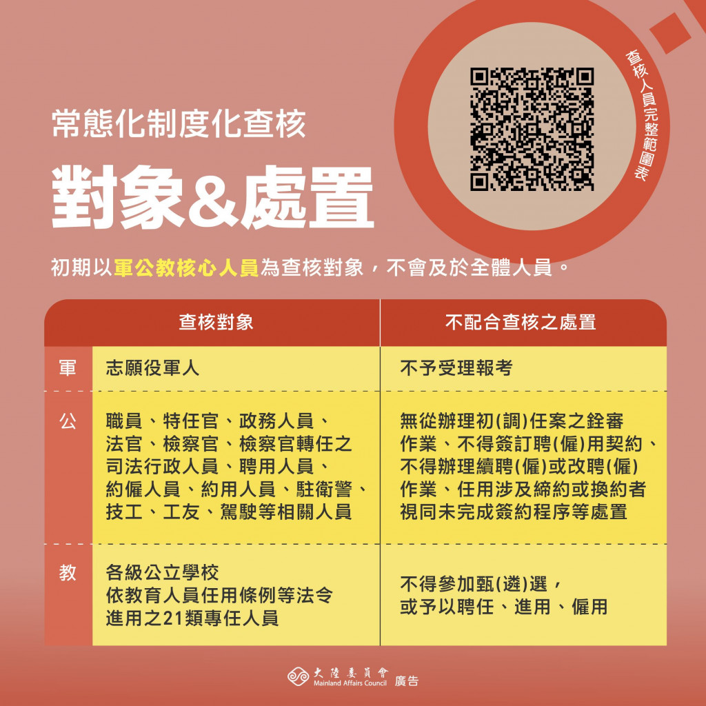 「常態化制度化查核軍公教人員不得在中國大陸設籍、領用中共相關身分證件」圖卡